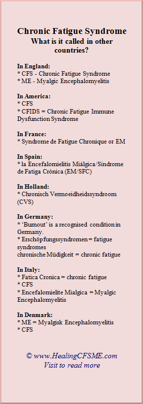 CFS is also known as Chronic Fatigue Immune Dysfunction Syndrome (CFIDS). This term is more often used in America. I haven't heard it used here in the UK.