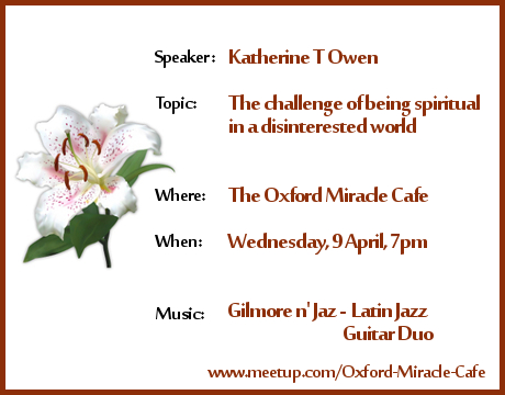 at the Oxford Miracle Cafe. The subject of the talk was "The challenge of being spiritual in a disinterested world". The evening included a guided meditation led by Katherine.